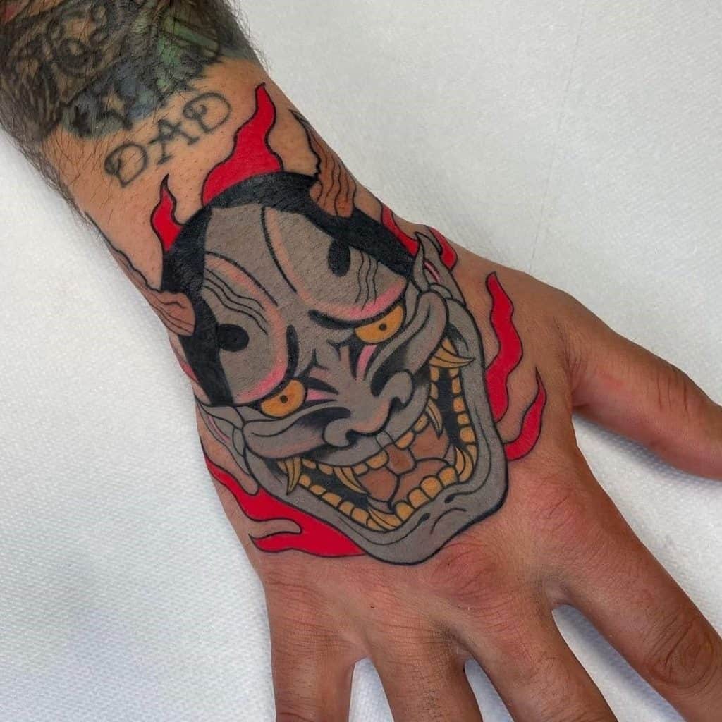 Red Oni Mask hand tattoo Celebrity Ink Japanese hand tattoos, Hand
